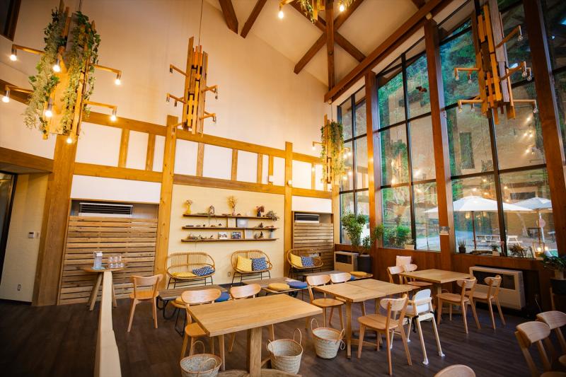 カフェレストランではランチを楽しめます。天井高い広々空間